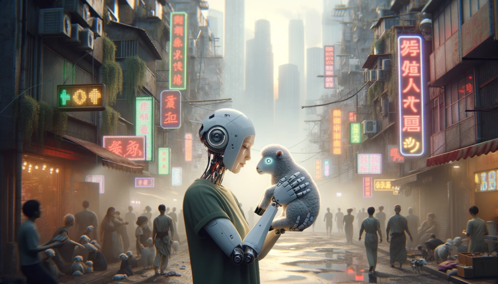 DALL·E 3 – „Do Androids Dream of Electric Sheep?“ ist der Titel eines Romans von Philip K. Dick, der 1968 veröffentlicht wurde. Die Frage, ob Androiden von elektrischen Schafen träumen, ist symbolisch und bezieht sich auf die tieferen Fragen des Romans bezüglich künstlicher Intelligenz, Empathie und was es bedeutet, menschlich zu sein.