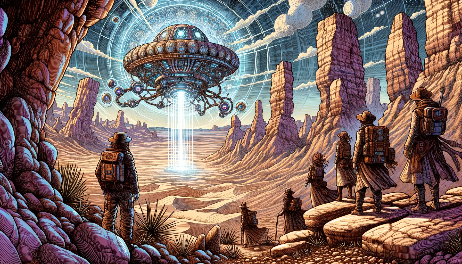 DALL·E 3, Prompt: Create a image inspired by the phrase „Beam me up, Scotty!“ in a style reminiscent of classic comic illustrations, such as those by iconic artists like Enki Bilal and Moebius.